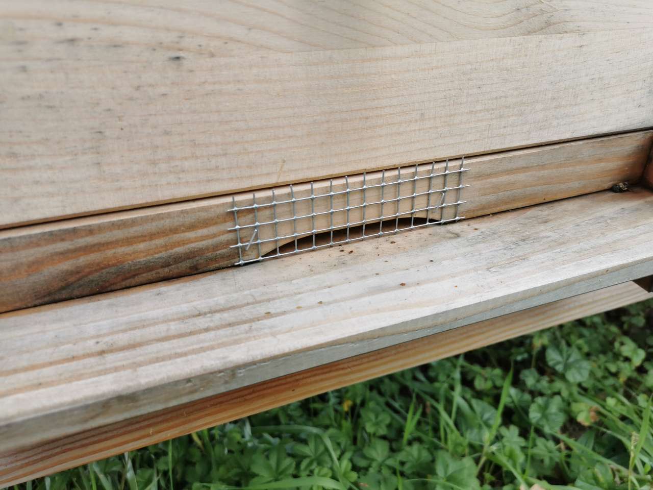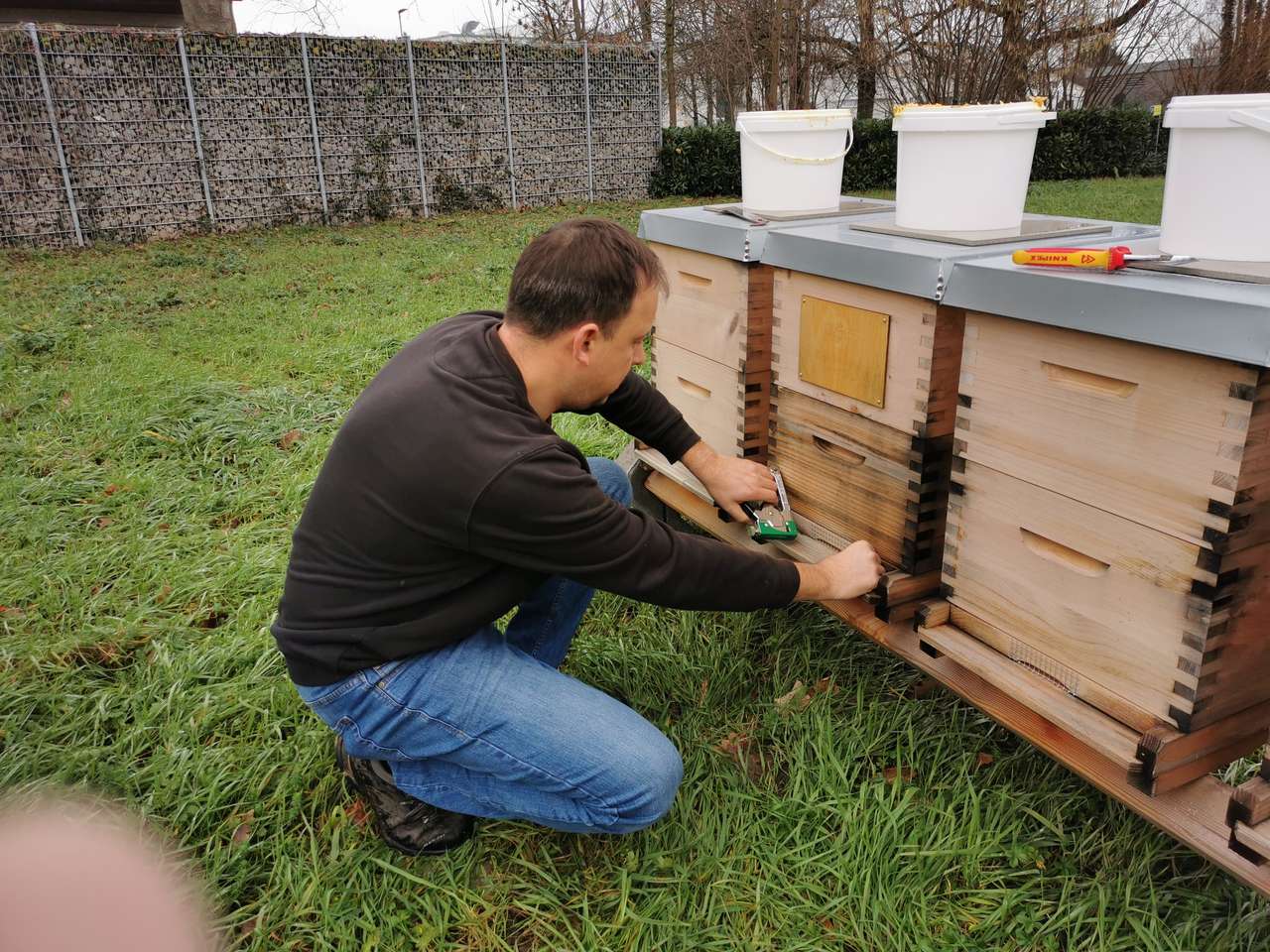 Im November wurden die Futtereimer entfernt, und das Bienenvolk kommt zur Ruhe. In kühlen Nächten ziehen sich die Bienen zu einer wärmenden Traube zusammen. Da sie sich in der Ruhephase nicht gegen Eindringlinge wie Mäuse und andere Nager zur Wehr setzen können, bringen wir ein Schutzgitter an. Es ist gerade groß genug, damit die Bienen hindurchschlüpfen können, aber klein genug, damit keine Spitzmaus durchpasst – diese lieben nämlich auch die süßen Leckereien in den Waben und die Bienenwärme.