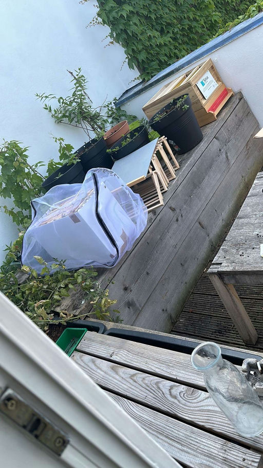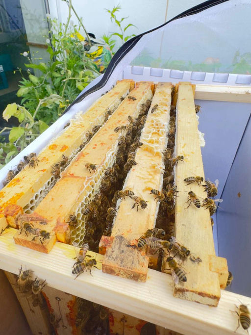 Heute Morgen sind endlich die Bienen angekommen. Nach einer kurzen Verschnaufpause von zwei Stunden zum Akklimatisieren durften sie direkt in ihr neues Zuhause einziehen. Jetzt muss das Bienenvolk nur noch die Königin befreien und kann dann direkt mit dem Ausbau der Mittelwände anfangen, sodass die rot markierte Königin für viele Nachkommen sorgt.