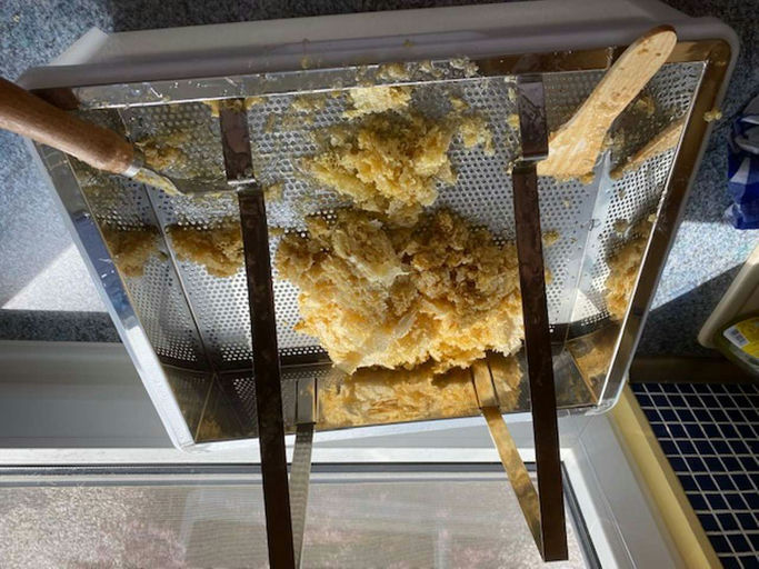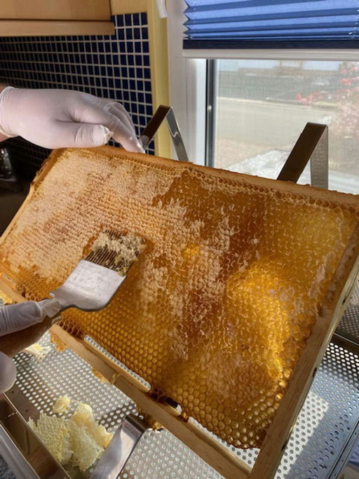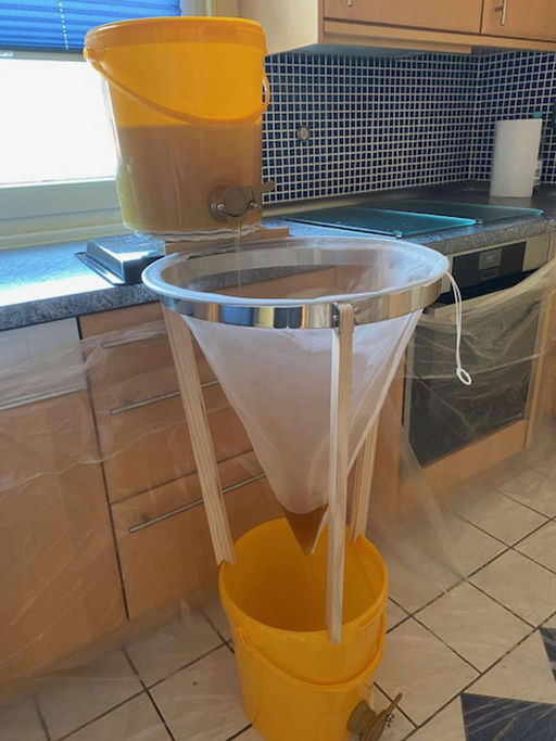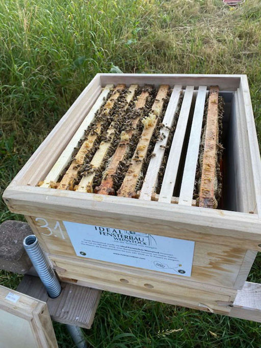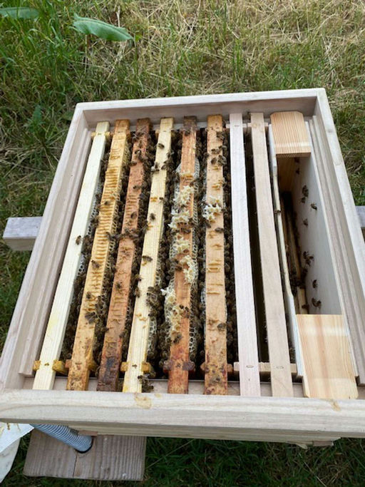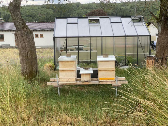 ... der im Juni erhaltene Ableger entwickelt sich prächtig. Im zweiten Brutraum wird fleißig Futter eingelagert und die Mittelwände werden ausgebaut. Gefüttert wird mit 50 % Apiinvert und 50 % Wasser, sodass dies zum Ausbau der Mittelwände anregt. Aufgrund der Fütterung gibt es keinen Honig von diesem Ableger, er wäre sowieso nicht stark genug, den Honigraum zu trocknen. In der Eifel blüht jetzt die Brombeere, das dürfte die letzte Tracht sein. Trotzdem ein kurzer Einblick in die Honigernte von meinem zweiten Stand ...