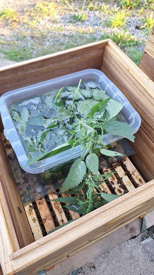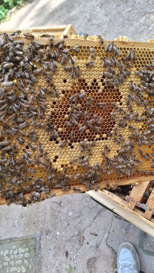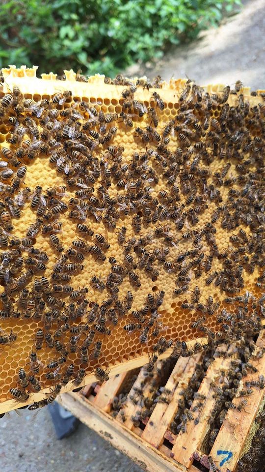 Die Saison ist gelaufen, von wegen! Nach einer Brutraumerneuerung muss auch die sogenannte Weiselrichtigkeit kontrolliert werden. Das bedeutet, dass man die Eiablage überprüft mit der Frage, ob die Königin überhaupt noch da ist und ob sie ausreichend Eier legt, um den Verlust durch die Erneuerung auszugleichen. Des Weiteren stellt man das Gewicht des Volkes fest und füttert ausreichend Bienenfuttersirup zu. Zu guter Letzt sollte man weitere Behandlungen gegen die Varroamilbe nicht außer Acht lassen. Wir haben unsere Bienen nun im September mit Apilife Var Bio, also mit Thymol, behandelt. Mh, wie das lecker am Bienenstand riecht!