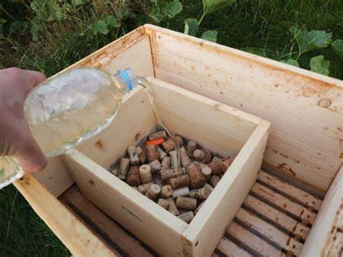 Nach der Ernte gibt man den Bienen erst einmal Futter zur Beruhigung. Das sind etwa 5 kg Zuckerlösung. Diese Maßnahme nimmt den Stress von den Bienen, und sie greifen nicht auf die verbliebenen Honigreserven zu, die sie zur Überwinterung benötigen. Nach der Auffütterung – diese dauert rund eine Woche – müssen die Bienen dringend gegen die Varroamilbe behandelt werden. Diese aus Indien eingeschleppte Milbe ist der Hauptparasit unserer Carnica-Bienen. Ohne Behandlung sind diese fast chancenlos. Die Behandlung wird mittels Ameisensäure durchgeführt. In einem Verdunster wird diese Säure ausgebracht. Dadurch entsteht im Bienenstock eine saure Atmosphäre, die die Bienen überleben, nicht jedoch die Milben.