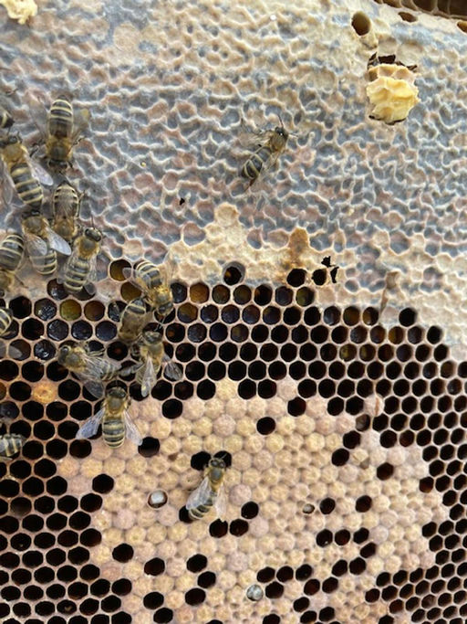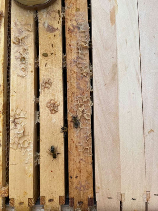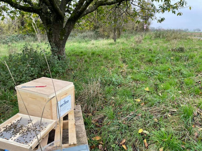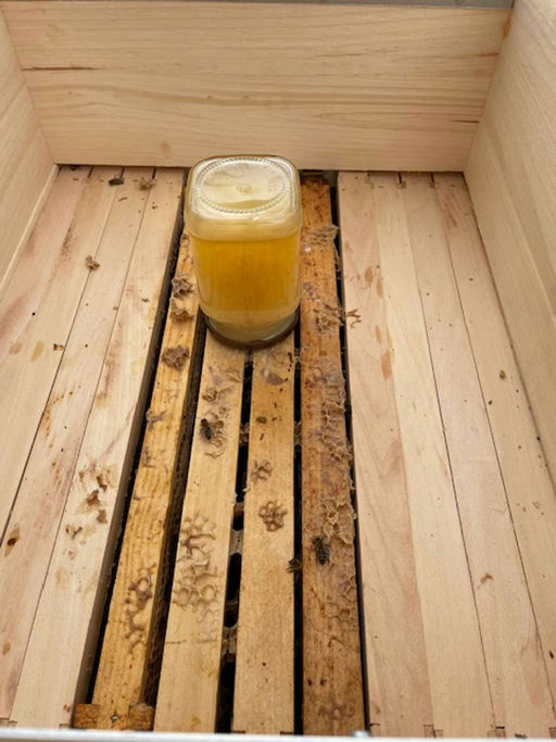 Wie ich bereits berichtet hatte, habe ich Anfang September einen Bienenableger mit vier Waben erhalten, die leider nicht voll mit Bienen besetzt waren. Dann war die Königin nach dem Einsetzen abhanden gekommen, und das Volk hat sich eine neue Königin nachgezogen. Das Volk war dann also etwa vier Wochen ohne Brut und hatte erst Anfang Oktober wieder Brut, was natürlich viel zu spät war, um noch genug Winterbienen aufzuziehen. Ende Oktober war das Völkchen zwar fit, aber heute, am 9. November 2024, waren kaum noch Bienen da. Es war zwar noch offene Brut vorhanden, aber zu wenig Bienen, um die Brut zu wärmen. Die Königin habe ich auch nicht gefunden. Ich habe sogar bei den toten Bienen auf dem Boden nachgeschaut, sie dort aber zum Glück nicht gesehen. Ich habe die wenigen Bienen, die noch da waren, jetzt mit Honig gefüttert. Als ich das Glas mit Honig aufsetzte, kamen sofort einige Bienen aus den Waben heraus. Ich bin gespannt, wie es mit dem Völkchen weitergeht.