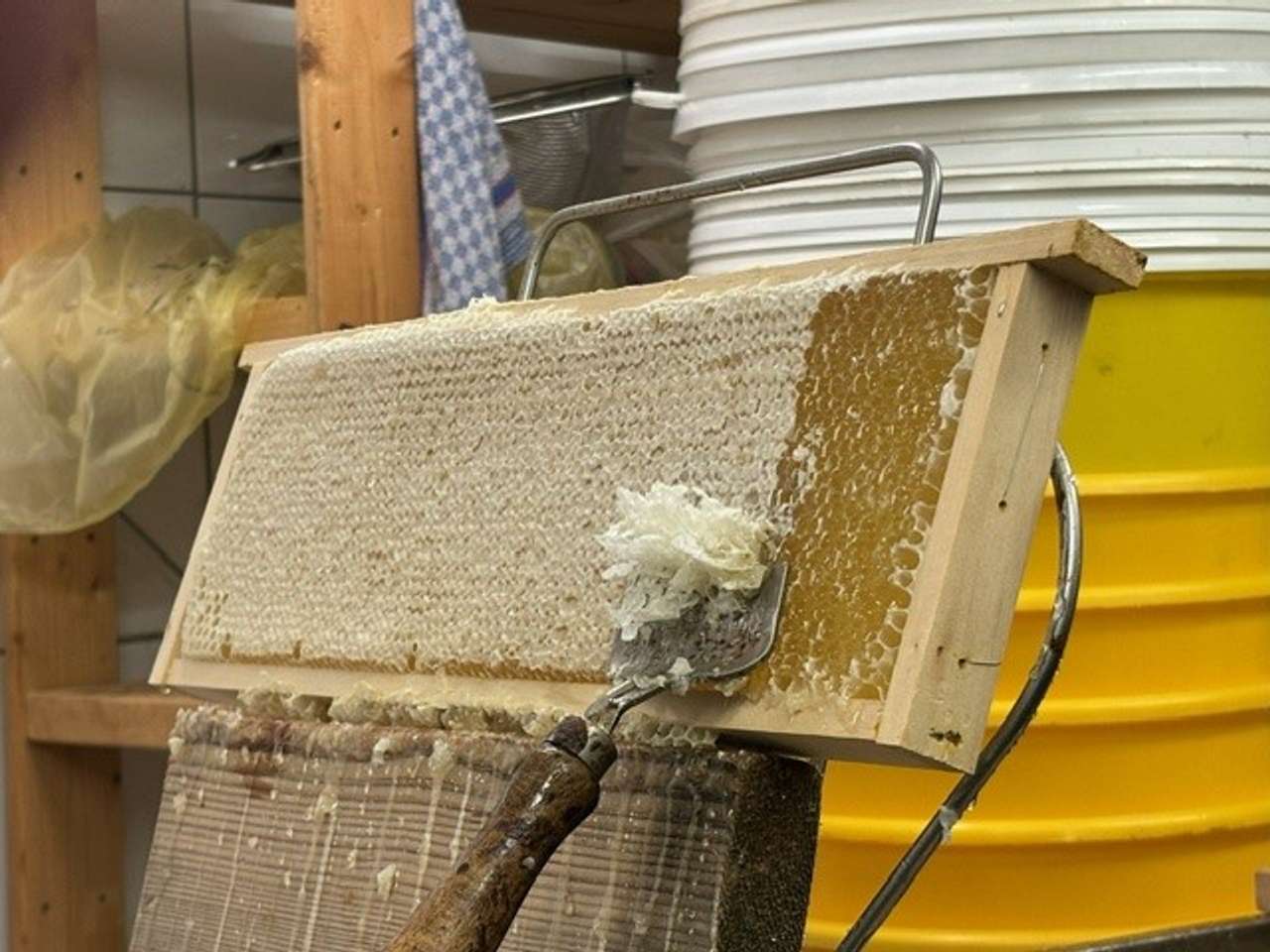 Entdeckeln: Die Wachsschicht wird mit einem Entdeckelungsmesser oder einer Entdeckelungsgabel entfernt, um den Honig freizulegen.