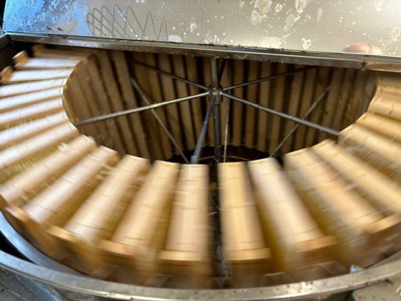 Schleudern: Die entdeckelten Waben werden in eine Honigschleuder gestellt. Durch Zentrifugalkraft wird der Honig aus den Waben geschleudert und sammelt sich am Boden der Schleuder.