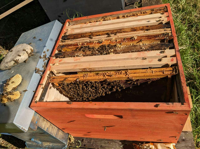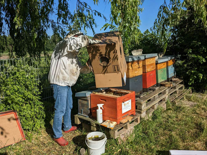 Aber es gibt auch gute Nachrichten. Das neue Volk für die Hellmabeute wurde geliefert. Die Bilder zeigen den Einzug in die Beute, die Behandlung mit Milchsäure (gegen Varroa) und die ersten Flugversuche des neuen Volkes.