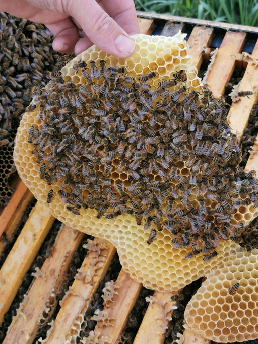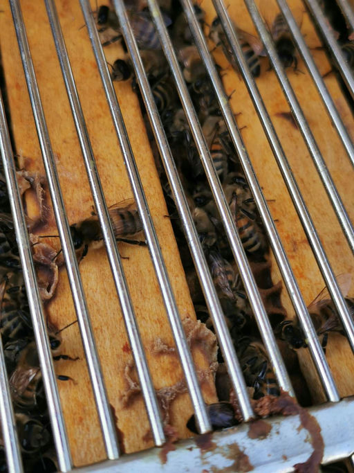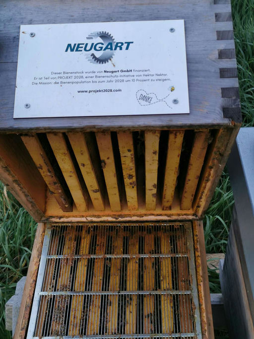 Ende März haben wir hier in Süddeutschland eine Hochdrucklage – also Sonnenschein und tagsüber Temperaturen über 20 Grad. Auch die Wettervorhersage für die ersten Apriltage ist gut. Sonne satt! Jetzt geht das große Blühen los: Frühes Wildobst, verschiedene Sträucher und Hecken rund um den Neugart-Standort öffnen ihre Blüten. Bei ein paar Völkern konnten wir schon den Honigraum aufsetzen, damit sie im Brutraum (untere Zarge) genug Platz für Brut haben. Die Kirschblüte dürfte jeden Moment aufgehen, und das ist erfahrungsgemäß der richtige Zeitpunkt für die Erweiterung der Bienenvölker. Ein Volk hat tatsächlich schon eine kleine Wildwabe gebaut, also höchste Zeit fürs Königinnen-Absperrgitter und darüber den Honigraum. Das Gitter trennt die Brut vom Honig, was es dem Imker leichter macht, den Honig zu ernten. Ansonsten würde die Königin Eier zwischen die Honigzellen legen, und man könnte die Waben nicht schleudern. Die Bienen sind schlanker als die Königin und können das Gitter durchlaufen.