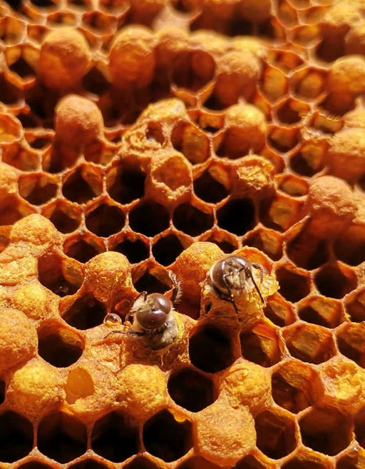 Männliche Bienen nennt man Drohnen. Diese schlüpfen aus unbefruchteten Eiern. Die Entwicklung von der Eibablage über die Larve zur Verpuppung und bis zum Schlupf beträgt bei Drohnen 24 Tage. Das ist drei Tage länger als bei Arbeiterbienen. Drohnen kann man ganz einfach von einer Arbeiterbiene unterscheiden: Sie sind größer, dicker und haben große Facettenaugen. Der Drohn ist stachellos und kann daher bei der Verteidigung des Bienenstocks nicht helfen. Auch sammelt er weder Pollen noch Nektar. Ganz im Gegenteil, er lässt sich füttern bzw. bedient sich später selbst an den Vorräten des Volks. Drohnen haben „nur“ eine Aufgabe: die jungen Königinnen beim sogenannten Hochzeitsflug zu begatten.