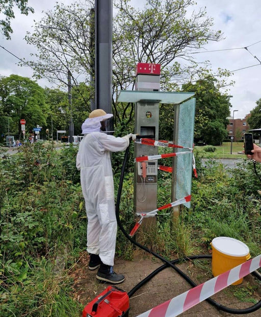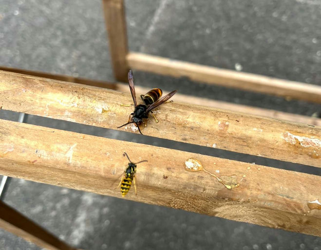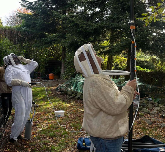 Die letzten Wochenenden standen ganz im Zeichen der asiatischen Hornisse (Vespa velutina), die unsere Bienen und die gesamte Biodiversität bedroht. Gemeinsam mit Axel Spies (Neusser Gold) und Holger vom Verein Velutina Niederrhein und seiner speziellen Lanze konnten wir mehrere Nester unschädlich machen – eine aufwändige, aber wichtige Arbeit zum Schutz unserer heimischen Insekten. Früher blieb uns oft nur das Absaugen der Nester – bei Primärnestern sinnvoll, bei Sekundärnestern allerdings nur mit Steiger möglich. Dieses Jahr kam sogar ein vom Sturm abgerissenes Nest vor einem Kindergarten hinzu – zum Glück rechtzeitig entdeckt und gesichert. Nur gemeinsam können wir das schaffen. Ein riesiges Dankeschön an Velutina Niederrhein und Andy Thissen, die uns mit Rat, Tat und Technik unterstützt haben. Wir haben unglaublich viel gelernt und hoffen, dass sich die Mühen im kommenden Jahr bemerkbar machen.