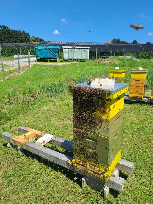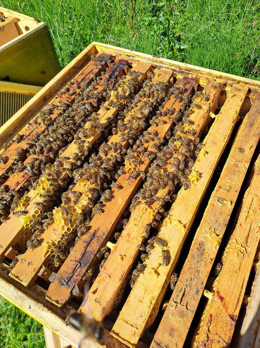 Bei endlich mal stabilem Schönwetter war eine entspannte Durchsicht möglich. Es wird eingetragen, teilweise finden sich auch verdeckelte Honigwaben. Ein Volk musste ich nun leider endgültig auflösen, die ursprüngliche Königin ist verschwunden, die nachzuziehende ist auch abhandengekommen. Zusätzlich hat mich der Züchter mit der bestellten Königin im Stich gelassen. Im Endeffekt ist das Volk buckelbrütig geworden, somit habe ich es aufgelöst. Die meisten Bienen haben sich gleich den Nachbarstock zum Einbetteln ausgesucht. Auch ist heute mal Rasenmähen möglich gewesen, was schon dringend notwendig war.