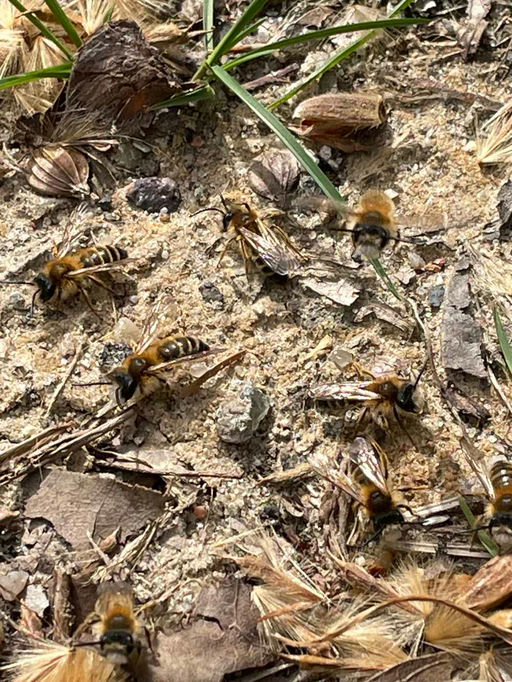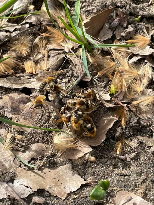 Dieses Wochenende konnte ich mich nicht nur an meinen Honigbienen erfreuen, sondern auch an zahlreichen Wildbienen. Ganz besonders fasziniert haben mich dabei eine Ansammlung an Sandbienen, die unweit ihrer Brutstätten zu Dutzenden über den Boden schwirrten. Da war das Handy schnell gezückt, um euch auch ein wenig an diesem Schauspiel teilhaben zu lassen. Ein paar dieser eigentlich solitär lebenden Bienen haben sich „gekloppt“. Worum es da ging, konnte ich nicht ausmachen. Ob dies bei dieser Bienengattung ein Paarungsritual oder doch der Verteidigung dient, ist mir leider nicht geläufig. Auch konnte ich keinen optischen Unterschied zwischen den Individuen ausmachen, also ob es sich um Weibchen, Männchen und/oder Königinnen gehandelt hat. Vielleicht entdeckt ihr ja auf meinen Fotos mehr als ich.