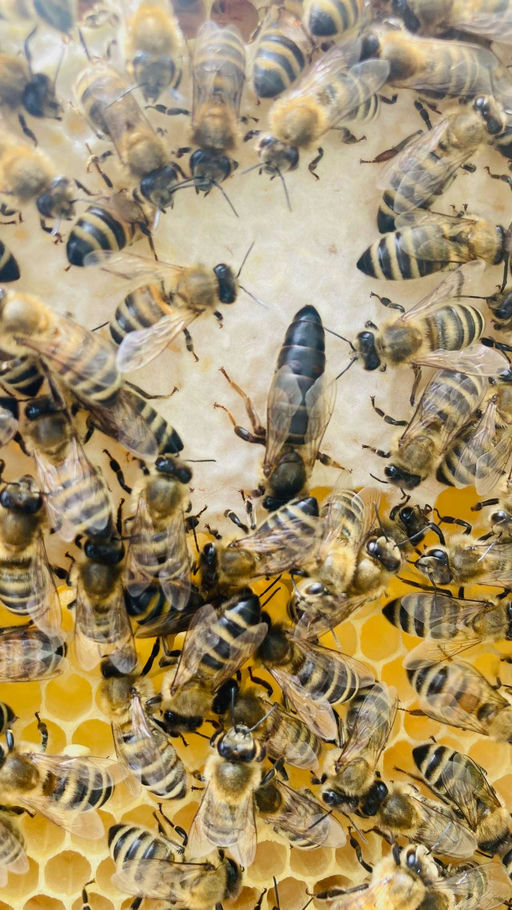 Der Juni 2024 ist verhältnismäßig kühl und regnerisch, sodass die Bienen oft tagelang nicht ausfliegen können. Umso wichtiger ist es, eine regelmäßige Schwarmkontrolle vorzunehmen, um weitere Schwärme zu vermeiden. Auch bei meinen Völkern musste ich feststellen, dass zwei Völker weisellos waren und ein Volk bereits wieder in Schwarmstimmung. Diesem Volk habe ich also eine Brutwabe mit Weiselzellen entnommen und dem weisellosen Volk zugehängt, sodass dieses Volk möglichst schnell wieder eine Königin hat. Leider ist eines der Völker trotzdem "buckelbrütig" geworden, sprich eine Arbeiterin hatte bereits angefangen, Eier zu legen. Zum Glück hat bei dem anderen Volk das Zuhängen geklappt und bei der nächsten Durchsicht war die Königin noch am Leben und hatte auch die ersten Waben schon bestiftet.