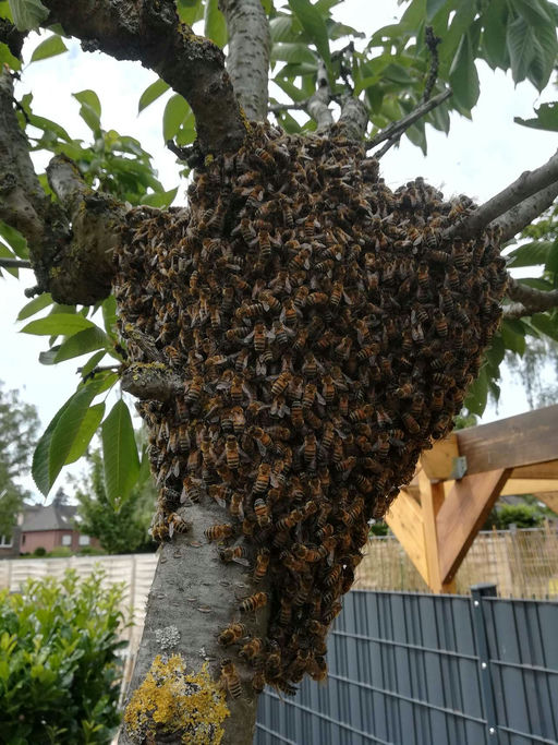 Meistens läuft es anders, als der Imker es geplant hat. Denn die Bienen machen, was sie wollen, und richten sich nicht nach den Wünschen des Imkers. In diesem Fall war die Überraschung besonders groß, da ein von mir gerade vor zwei Wochen gebildeter Ableger auf einmal meinte, er müsse sich teilen und anfangen zu schwärmen. Da war es dann so weit, dass ich den Schwarm aus dem nächsten Kirschbaum holen durfte. Man lernt halt nie aus.