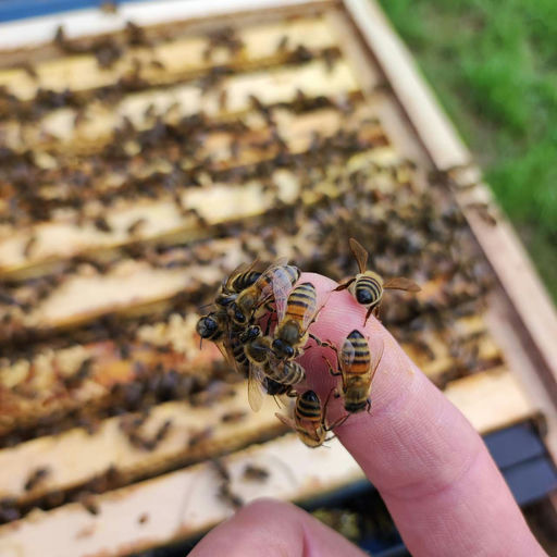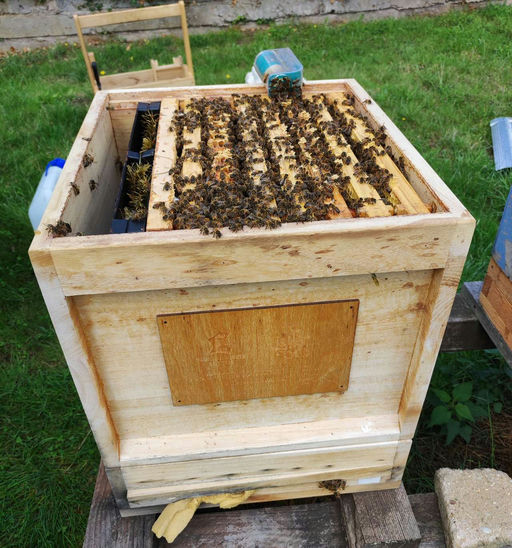 Nach der negativen Weiselprobe im September wurde ich Anfang Oktober von dem Volk positiv überrascht. Das Volk hat sich eine wunderschöne Königin nachgezogen und bereits ein Brutnest angelegt. Die brutfreie Zeit habe ich für eine Sprühbehandlung genutzt. Dadurch ist das Volk jetzt nahezu milbenfrei und kann gesunde Winterbienen aufziehen. Auf den Bildern sieht man die neue Königin. Auf dem anderen Bild sieht man meine Finger, mit denen ich die Königin gefangen habe. Die Pheromone der Königin ziehen die Bienen zu meinen Fingern...