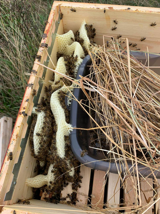 Der Honig der Hektarnektar-Bienenvölker wurde am 25.07. geschleudert, und es ist ein sehr schöner Lindenblütenhonig geworden. Mein Bienenpate Aioi Nissay Dowa war mit dabei, hat das Schleudern gefilmt und wird dazu wieder ein kleines Video posten. Jetzt werden die Völker eingefüttert. Bei der Kontrolle gestern habe ich gesehen, dass die Völker ordentlich Wildbau angelegt haben. Das liegt wohl daran, dass ich zur Varroabehandlung eine komplette Brutentnahme gemacht habe und die Bienen die Mittelwände neu ausbauen müssen. Naja, ist nicht schlimm, den Wildbau mache ich demnächst weg und lege die Waben auf den Boden der Beute, dann können die Bienen den eingelagerten Honig in die normalen Rähmchen umtragen.