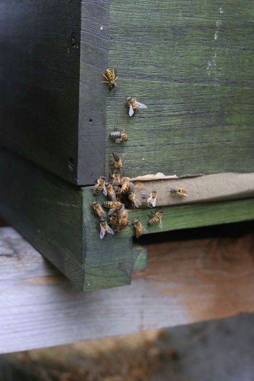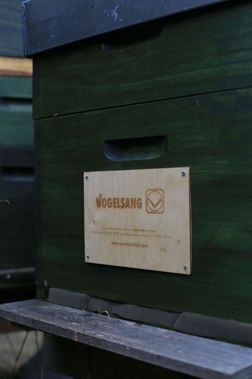 Die Holzplakette von Vogelsang ist nun da und bereits an der Beute angebracht. Jetzt sieht man schon von Weitem, um welches Volk es sich hier handelt. Die Bienen werden aktuell aufgefüttert, zuerst mit Futterteig, dann mit Sirup. Damit es nicht zu einer Räuberei kommt, wird das Flugloch eingeengt.
