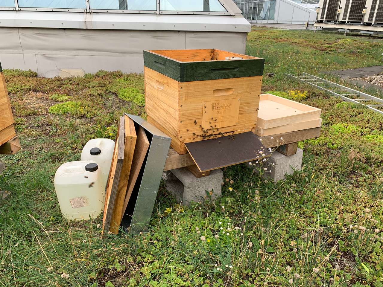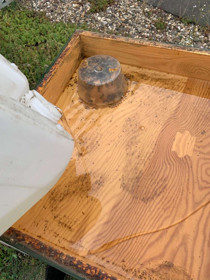 Nach der Varroabehandlung erhalten die Bienen weiteres Futter, damit sie für den Winter reichlich Vorräte einlagern können. Aus einem Kanister wird der Bienenfuttersirup in den Fütterer gegossen. Dies ist eine Holzzarge, in die die Bienen durch eine Öffnung von unten hineingelangen können, um den Sirup aufzusaugen und in ihr Brutnest zu transportieren und einzulagern.