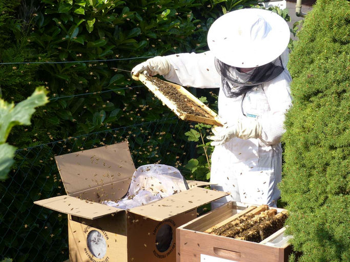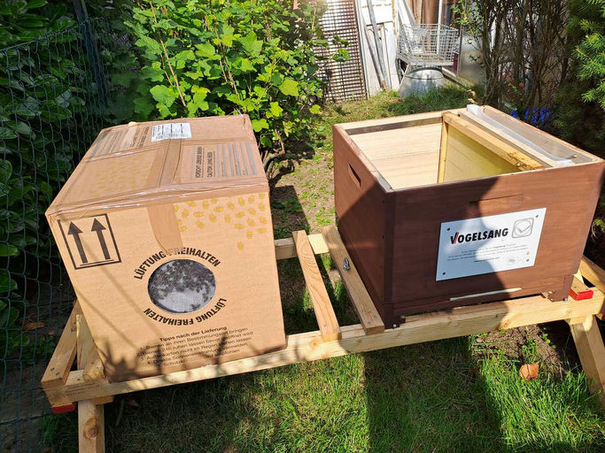 Heute wurde das neue Volk von einer Spedition gebracht. Nach einer Ruhephase im dunklen und kühlen Keller konnten die Bienen in die vorbereitete Beute umziehen. Die Königin befand sich mit einigen Begleitbienen in einem Käfig.