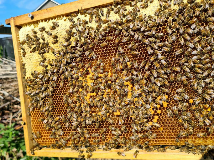 Nachdem das Volk in den letzten Wochen unbehelligt wachsen konnte, gab es heute beim Honigabräumen der Nachbarvölker eine kleine Kontrolle. Das Volk hat sich erstaunlich gut entwickelt und bereits einige Futterkränze angelegt. Damit sie auch weiterhin die benötigten Vorräte sammeln und einlagern können, gab es heute ein Päckchen Futterteig (ähnlich wie Fondant). Die in der Leerzarge platzierte Schale ist schon für den zukünftigen Zuckersirup vorbereitet.