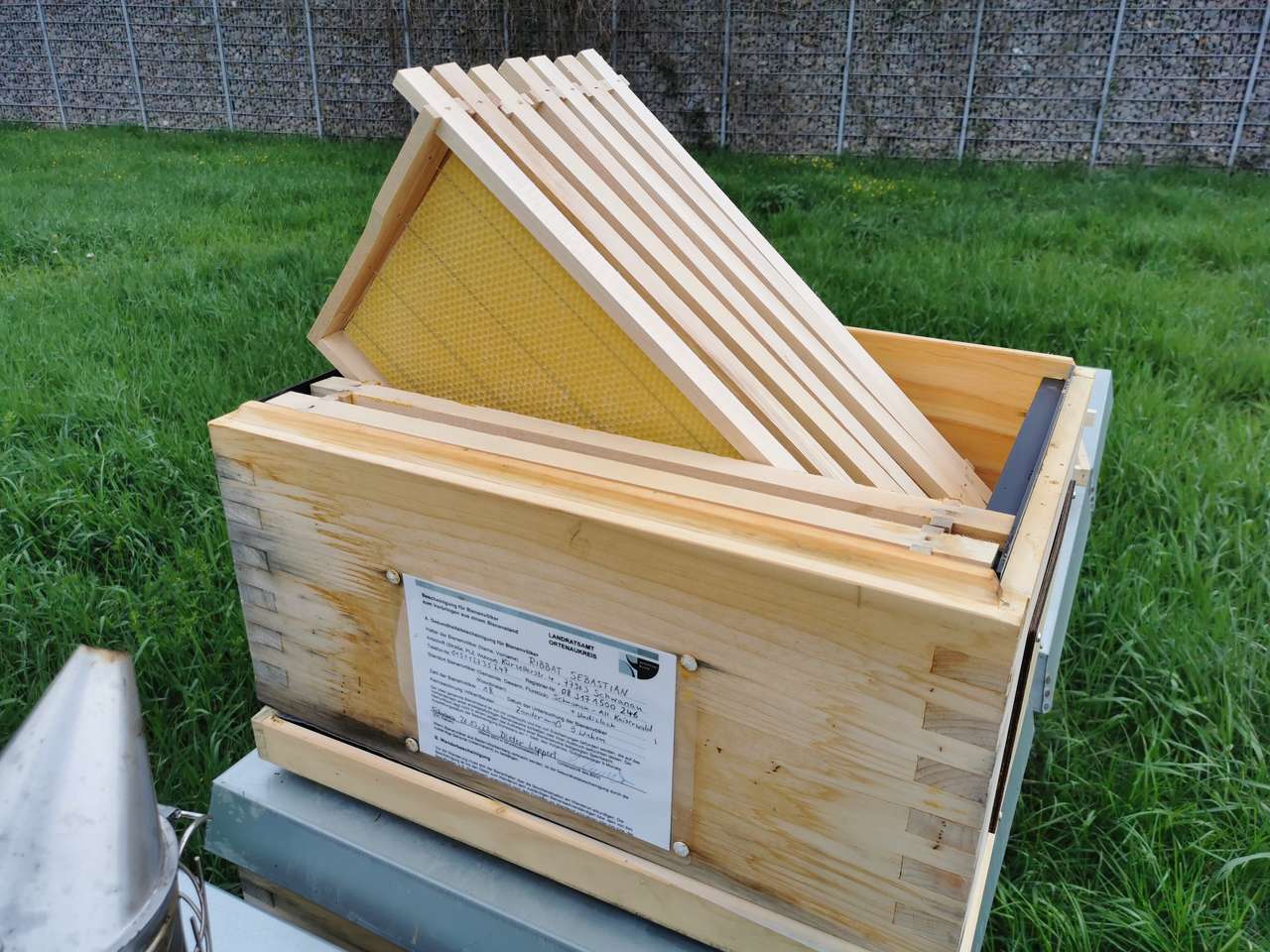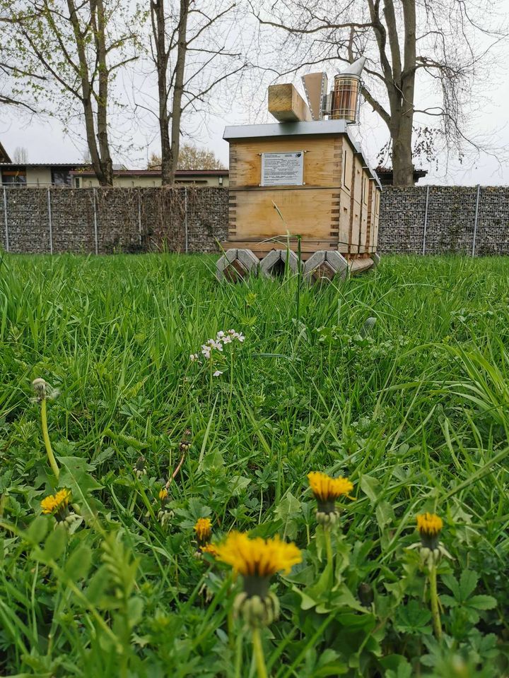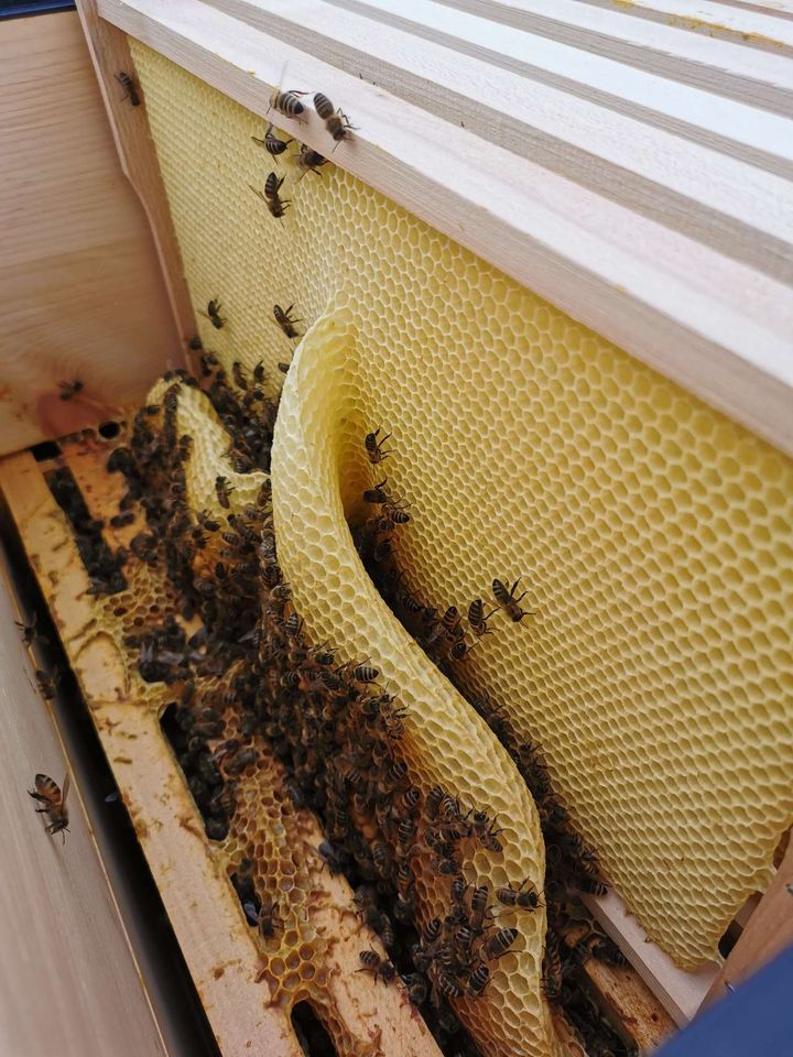 Ende März blühen hier schon der Löwenzahn und die Kirschen – leider sind die Temperaturen für Sammelflüge noch zu frisch. Die Völker wachsen trotzdem, wie man am wilden Wabenbau erkennen kann. Es ist höchste Zeit für die Erweiterung mit zusätzlichen Waben. Auch der Futtervorrat wurde aufgrund der Kälteperiode noch einmal überprüft. Nun hoffen wir auf einen warmen, sonnigen April.