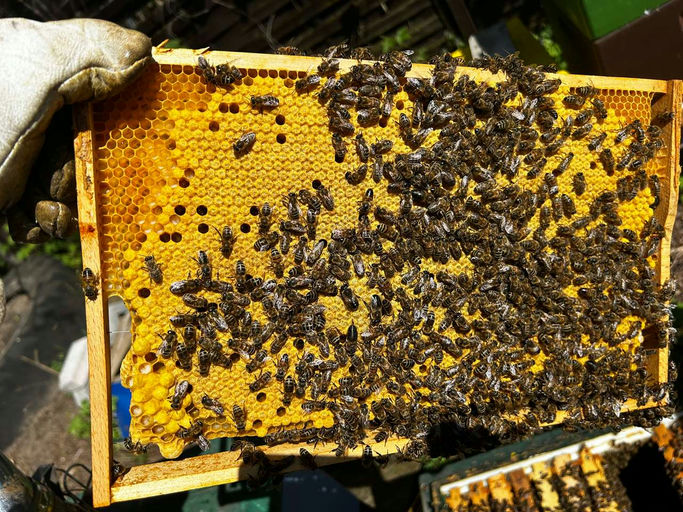 Endlich kommt die Sonne, und meine Bienen fliegen fleißig. Die Beuten füllen sich, und die erste Tracht steht vor der Tür. Ich schaue jetzt alle 7-9 Tage meine Beuten durch, ob bei meinen Ladys Schwarmstimmung entsteht. Der Drohnenrahmen wird eingesetzt (für mich ein Indikator für die Schwarmstimmung). Auf meine starken Wirtschaftsvölker setze ich den Honigraum über ein Absperrgitter. Damit meine Bienen nicht in Schwarmstimmung geraten, schröpfe ich meine Völker und entnehme aus dem Brutraum 1-2 Rähmchen zur Ablegerbildung. Die freien Stellen werden mit Mittelwänden aufgefüllt. Zum Ableger gebe ich noch Futterwaben und leere Mittelwände hinzu. Damit ist der erste Schritt für mich erledigt. Nun heißt es warten und in ein paar Tagen kontrollieren, ob in meinen Ablegern Weiselzellen angelegt worden sind. Der Raps steht jetzt Anfang Mai in voller Blüte. Ich bin gespannt auf das Ergebnis bei der ersten Honigtrachternte.