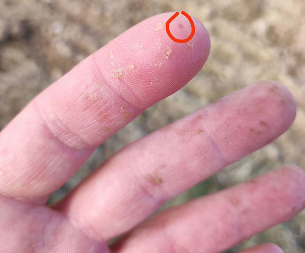 Die lange Dürre ist vorbei und es hat ein paar Tage in Folge geregnet. Die Pflanzen, die noch da sind, tragen wieder Pollen. Die Bienen merken, dass es auf den Herbst zugeht und verringern die Brutaktivität. Die Bienen werden bei der Durchsicht unruhiger und tragen jede Menge Propolis ein. Ein Stich in die Fingerkuppe bezeugt das bei der heutigen Durchsicht. Die Fingerkuppe ist immer besonders schmerzhaft, weil dort viele Nervenenden zusammenlaufen, und treibt auch einem Hobbyimker mal eine Träne in die Augen.