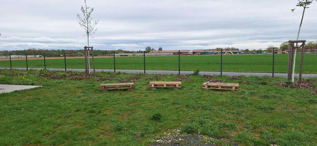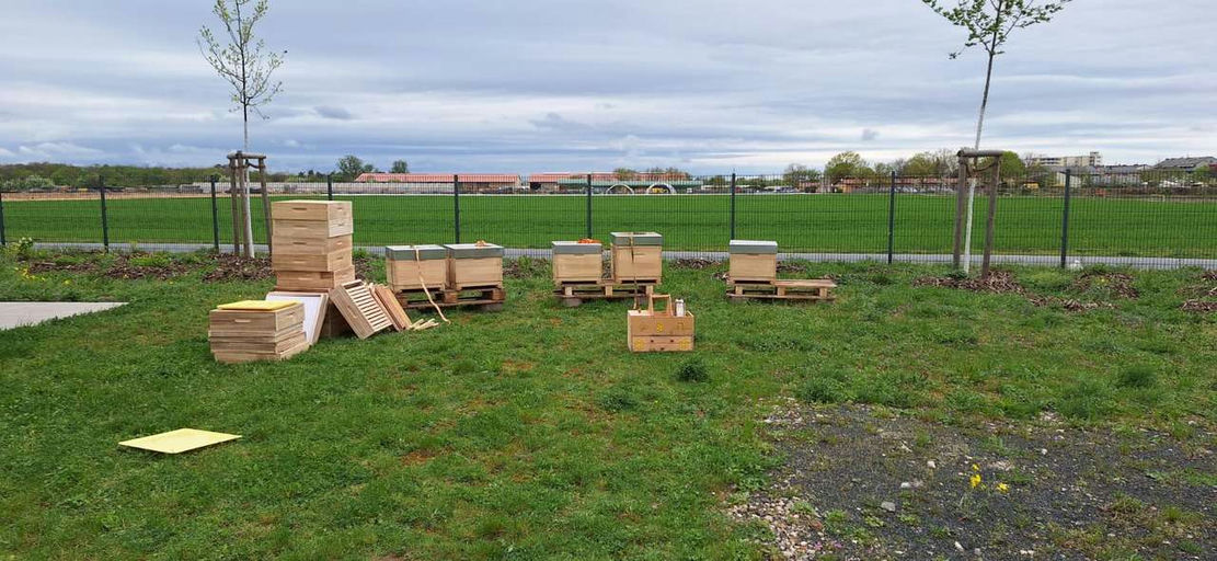 An einem sehr windigen Tag war es endlich soweit. Die Bienen konnten auf das Firmengelände ziehen. Zuerst haben mein Partner und ich die Paletten ausgerichtet, auf denen die Beuten Platz finden. Danach kamen die Brutraumzargen, ein Absperrgitter, zwei Honigräume, eine Abdeckfolie, der Innendeckel, die Bienenflucht, die Futterzarge und der Blechdeckel. Es war so windig, dass uns teilweise die Beutenteile weggeflogen sind. So etwas erlebt man in Hessen selten. Da die Bienen vom Umzug und vom Wetter sehr gereizt waren, haben wir nur das Allernötigste gemacht. Ich habe in der direkten Nachbarschaft schon eine Apfelplantage in voller Blüte gesehen – das ist der perfekte Start. Nun können die fünf Bienenvölker ordentlich Nektar eintragen.