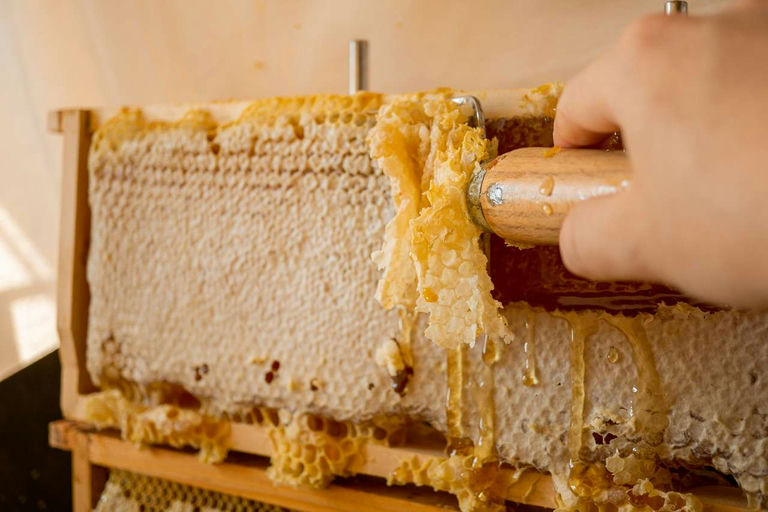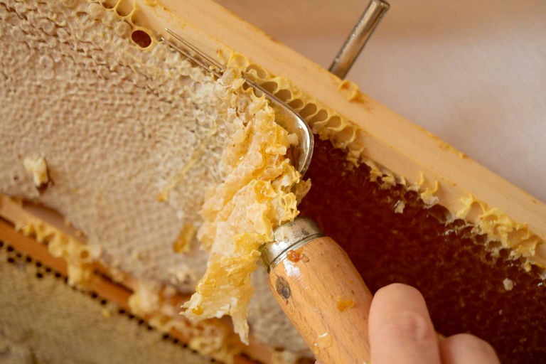 Die einzelnen Honigwaben werden vor dem Schleudervorgang entdeckelt, das heißt, die dünne obere Wachsschicht wird entfernt. Hier gibt es verschiedene Methoden – ich mache das mit Hilfe einer Entdeckelungsgabel. Der aus der Schleuder fließende Honig wird durch ein Sieb grob gefiltert, sodass unter anderem Wachsstücke oder kleine Verunreinigungen vom Honig entfernt werden können. Nach ein paar Tagen Klärzeit kann der Honig schließlich abgefüllt werden.