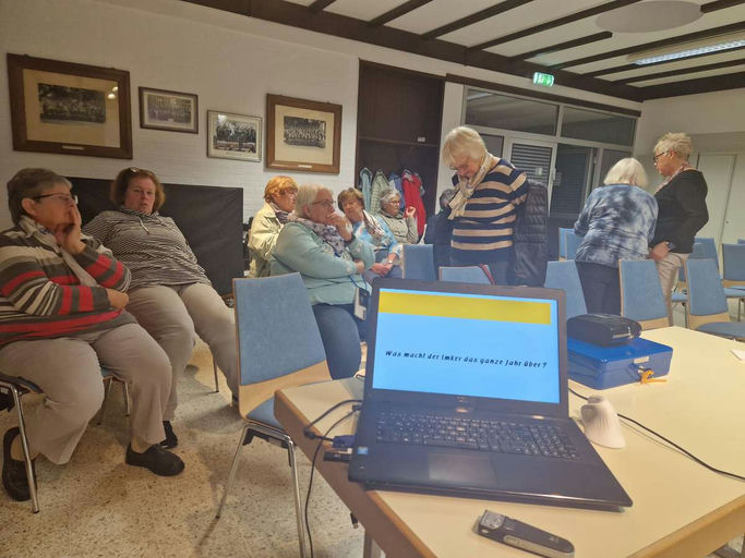 Ende September beginnt die Erntedankzeit und somit auch die Apfelernte auf der Streuobstwiese. Jetzt gilt es, zu ernten, was die Bienen bestäubt haben, und das war in diesem Jahr wieder mehr, als wir selbst benötigen. Für den Eigengebrauch werden ca. 300 kg Äpfel geerntet, dazu kommen noch ein paar wenige Birnen und natürlich die Quitten für den Likör. Nebenbei werden die Völker fertig eingefüttert und die Restentmilbung im Rahmen der Varroabekämpfung durchgeführt. Beim örtlichen Erntedank- und Kelterfest durften wir unsere Produkte mit unserem kleinen Verkaufsstand anbieten und auch zahlreiche neue Kunden gewinnen. Beim örtlichen Landfrauenverein waren wir eingeladen und berichteten, was der Imker das ganze Jahr über machen muss, bis ein Glas Honig auf dem Frühstückstisch steht. Abgerundet mit einer Verkostung der Leckereien war die Veranstaltung ganz gut gelungen, und die Damen hatten einen Einblick.