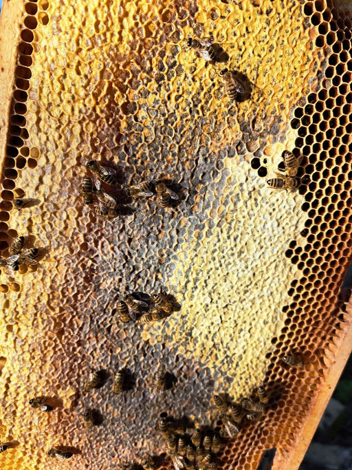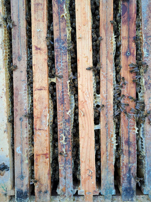 Auf den Bildern zu sehen: Das Volk ist sehr stark durch den Winter gekommen. Die Futtervorräte sind reichlich. Es gibt schon "auslaufende Brut" – also Bienen, die bereits am Schlüpfen sind – und natürlich alle jüngeren Stadien der Brut. Das bedeutet, dass die Königin lebt und schon aktiv ist – nach den warmen Tagen Mitte Februar war das so zu erwarten. Bis zur Kirschblüte ist alles, was sie finden, zum eigenen Verzehr für die Bienen gedacht. ;)