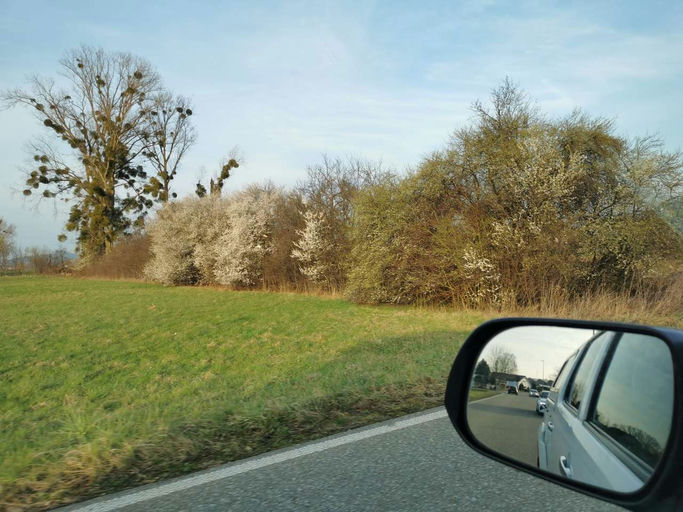 Gegenüber vom Neugart-Verwaltungsgebäude blühen die ersten wilden Hecken und Sträucher, strahlend weiß, meist Kirschpflaume. Wenn mittags die Sonne scheint und die Temperatur über 12 Grad klettert, macht sich die eine oder andere Biene schon auf den Weg zu den Blüten, denn die Brut (Larven) braucht Pollen als Nahrung.