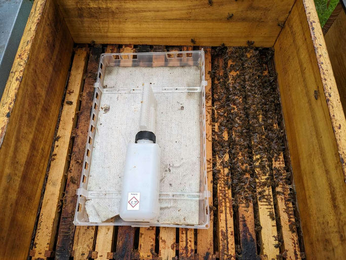 Die zweite Aufgabe ist die Behandlung gegen die Varroamilbe. Das geschieht im August mit Ameisensäure. Diese vernichtet die Milbe auch in der Brut. Für die Behandlung nutze ich den sogenannten Nassenheider Verdunster Comfort. Dieser wird mit Ameisensäure befüllt und in die Beute eingebracht. Durch das enthaltene Vlies wird über circa zwei Wochen kontinuierlich Ameisensäure verdunstet, und die Milbe stirbt ab. Um den Verdunster zu nutzen, muss die Beute erhöht werden. Dies mache ich mit einem Honigraum ohne Honigrähmchen. Nach etwa zwei Wochen wird kontrolliert, ob die Ameisensäure komplett verdunstet ist. Zwei Wochen später wird überprüft, wie stark der Varroabefall nach der Behandlung noch ist. Das passiert mit einem Bodenschieber. Ist ein Milbenbefall von mehr als einer Milbe pro Tag pro Volk vorhanden, wird die Behandlung wiederholt.