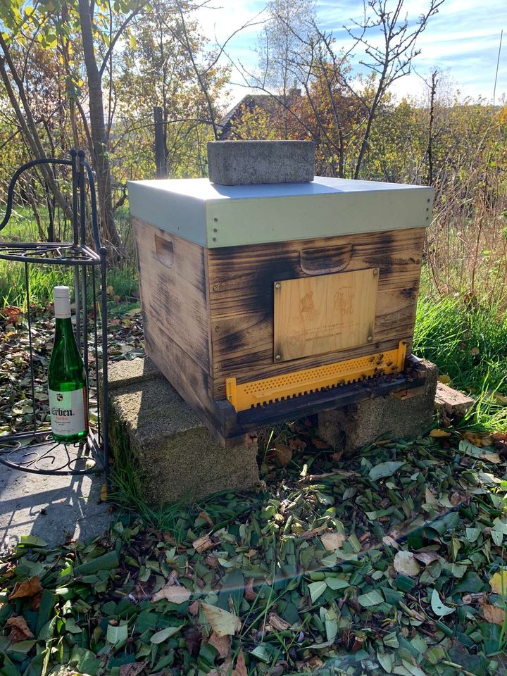 In den letzten Wochen war schönes Wetter und bei den Bienen herrschte starker Flugbetrieb. Diese Chance habe ich genutzt, um ein letztes Mal in die Beute zu schauen. Ich war erstaunt darüber, dass das Brutnest noch relativ groß war und dass die Königin noch in Eilage ist. Zum Abschluss habe ich die Futterwaben kontrolliert und das Volk auf eine Zarge eingeengt. So kann das Volk bis zur Winterbehandlung bleiben.