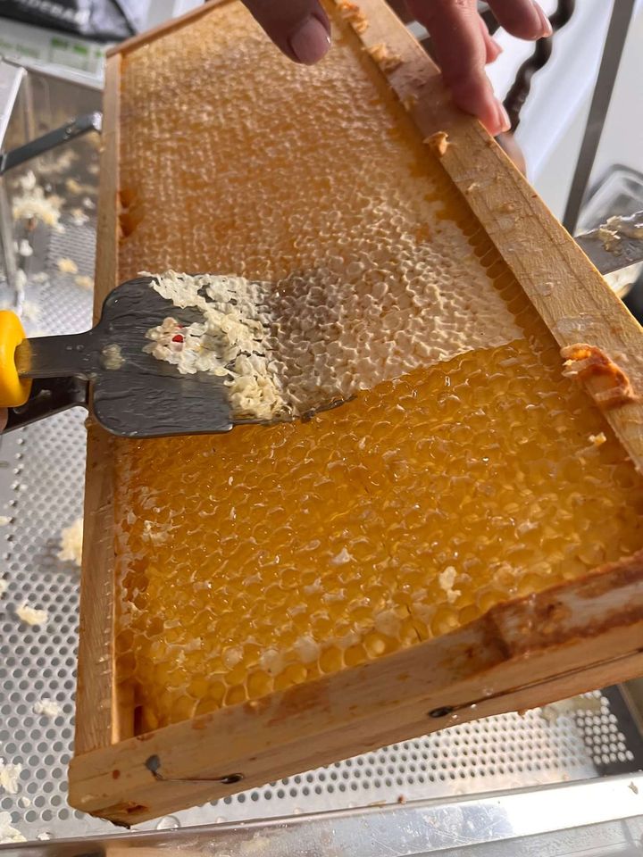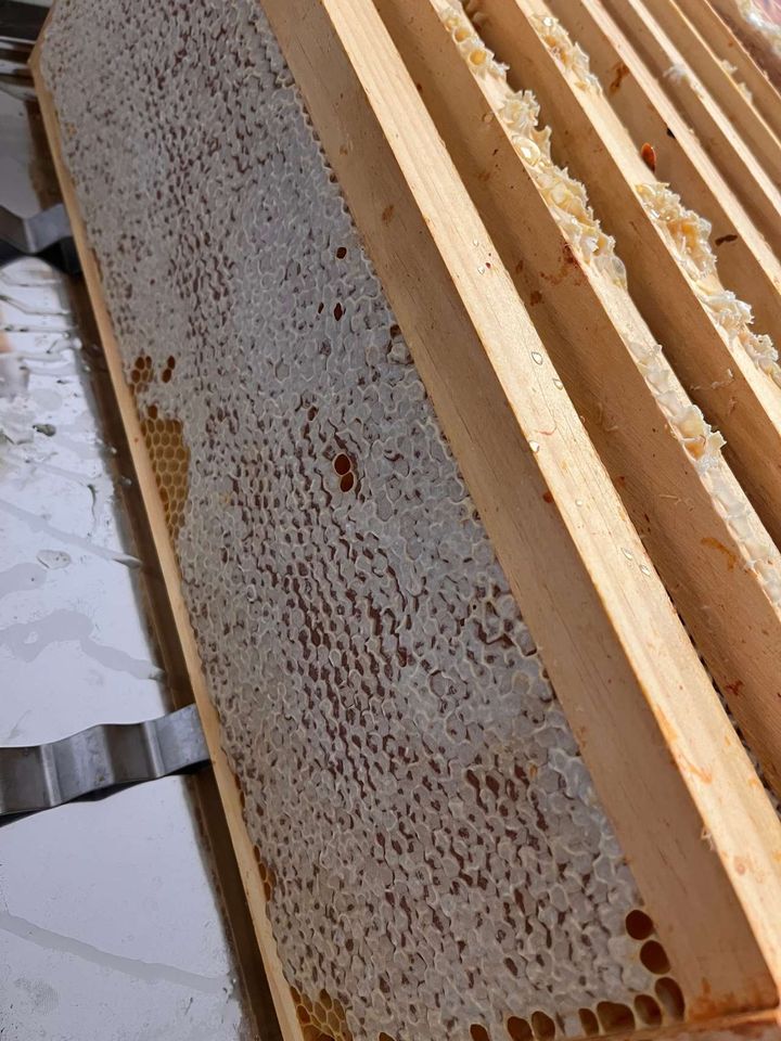 Ist das nicht der Wahnsinn? Wir hätten nie damit gerechnet, dass unsere Queen und ihr Volk eine solche Entwicklung machen würden. Das Volk ist explodiert, die Honigräume wurden ausgebaut UND mit köstlichem Honig gefüllt. Fast zwei Honigzargen konnten wir dem Volk entnehmen. Was wir so überragend finden, gefällt unserem Völkchen nicht unbedingt. Im Gegensatz zum Rest des Jahres, in dem wir stets ohne Schutzkleidung und Rauch arbeiten konnten, waren die Damen aufgrund der bestehenden Existenzgründe nicht mehr ganz so friedlich und recht aufbrausend. Dafür können wir jetzt schon sagen, dass sie einen ganz feinen Honig mit einer leichten Minz-Note (Lindenblüte) produziert haben. Jetzt wird geschleudert und abgefüllt.