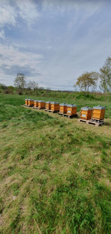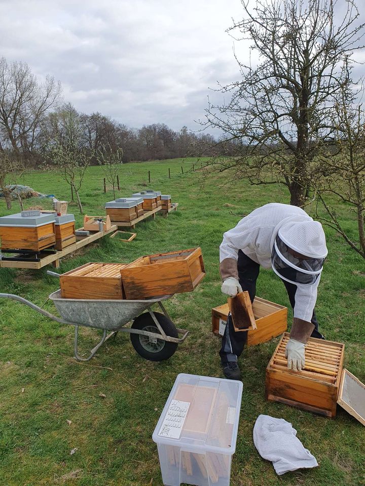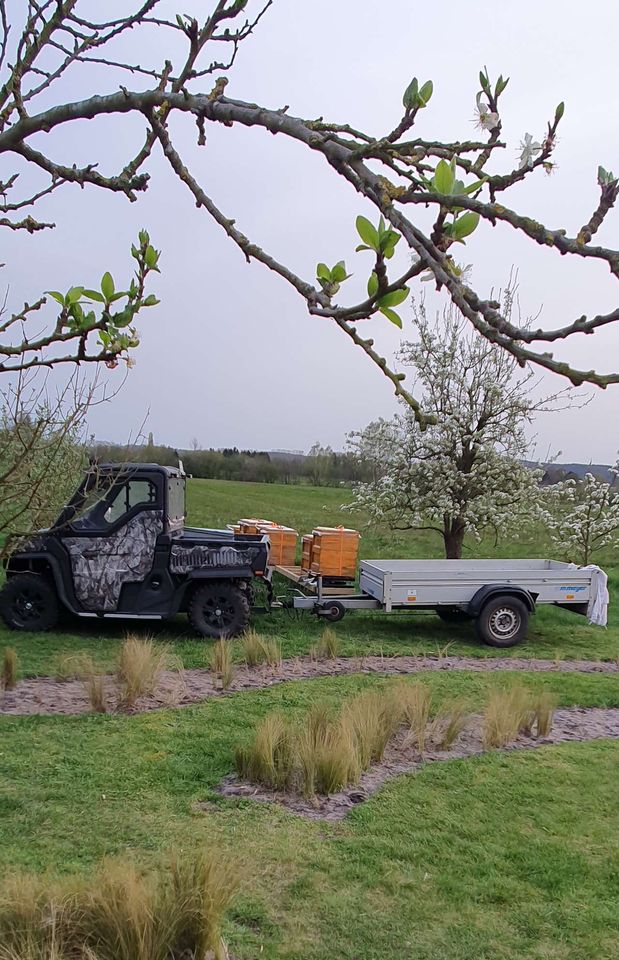 In diesem Frühjahr beginnt die Obstbaumblüte und die Rapsblüte schon recht früh. Ich habe die alten Waben entfernt, ein Absperrgitter aufgelegt und einen Honigraum aufgesetzt. Alle Bienenvölker stehen nun bei einem befreundeten Landwirt auf dem Hof. Ringsherum sind Rapsfelder. Leider ist einiges an Raps durch den vielen Regen zu Schaden gekommen. Nun heißt es abwarten und regelmäßige Schwarmkontrollen durchführen.