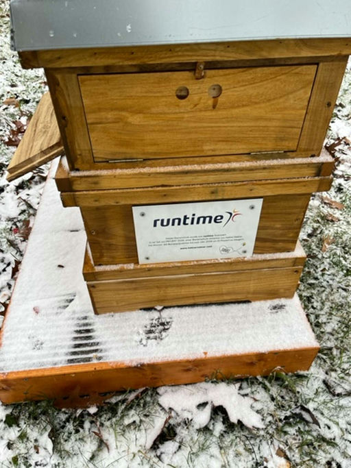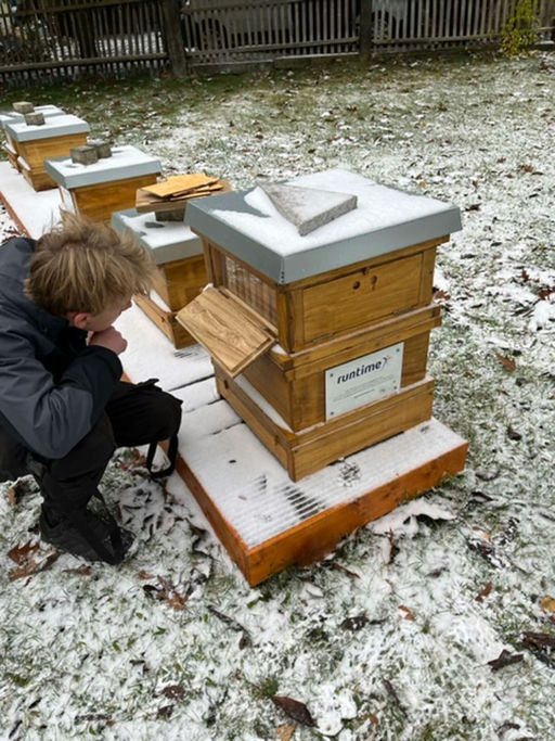 Es schneit, es schneit, Bienchen bleibt im Haus. Der erste Schnee ist gefallen und die Bienen haben sich nun in einer Traube zusammengefunden, um sich gegenseitig zu wärmen. Die richtigen Schilder sind nun angebracht und wir haben noch einmal überprüft, ob alles in Ordnung ist.