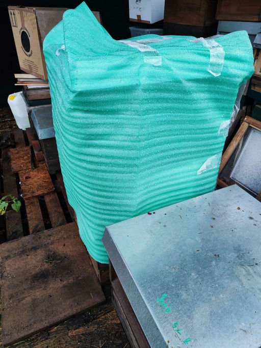 Das Volk brummt hörbar, und die Futterkontrolle war positiv – sie haben noch genug Vorräte. Bei den warmen Temperaturen der letzten Tage war es trubelig vor dem Ausflugloch, und ich habe einige wenige tote Bienen ausgefegt. In der Windel waren nach der Behandlung mit Oxalsäure viele tote Varroen zu sehen. Auch hier zeigt sich wieder, wie massiv der Befall im letzten Jahr war. Ich hoffe, dass die Mädels jetzt etwas Ruhe vor ihnen haben. Da die Temperatur nun noch einmal stark abfällt, habe ich die Beute mit dicker Schutzfolie eingewickelt, damit die Bienen es leichter haben, die Temperatur zu halten.