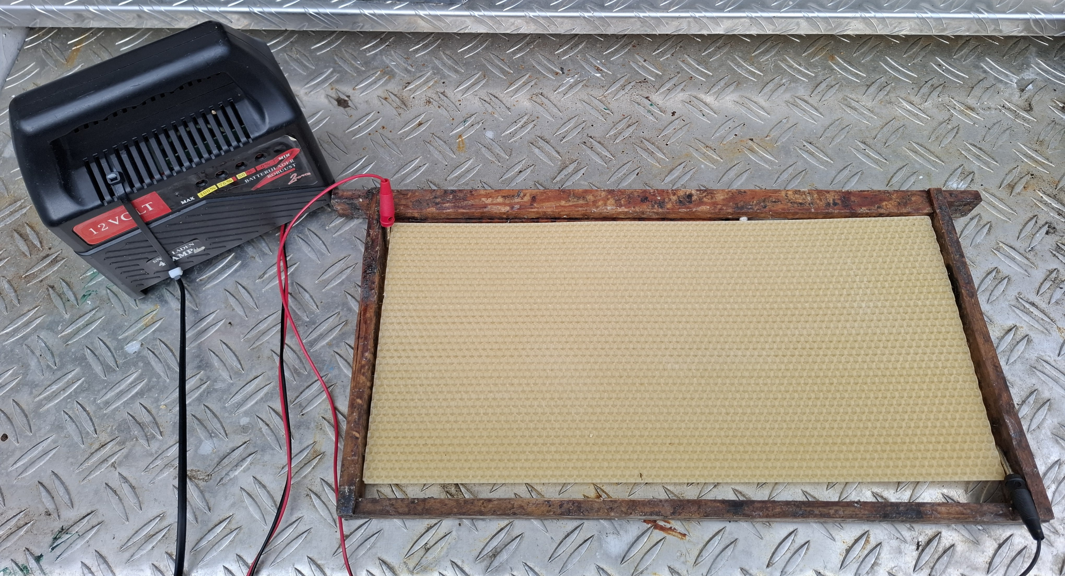 Um den Zustand der Waben zu prüfen, entnimmt der Imker ein Rähmchen, das aktuell leer ist. Anschließend hält er dieses Rähmchen gegen eine Lichtquelle und hält gleichzeitig eine Hand dahinter. Ist die Hand nicht erkennbar, muss das Rähmchen getauscht werden. Die Mittelwand ist schmutzig. Imker verwenden Mittelwände (Wachsplatten), die in Rähmchen eingelötet werden, um die spätere Bauarbeit der Bienen zu lenken, wenn auf den Mittelwänden neue Waben entstehen. Das Einlöten erfolgt häufig mit einem Trafo oder Ladegerät einer Autobatterie. Um die Mittelwände sicher am Drahträhmchen zu befestigen, wird durch den Draht innerhalb des Rähmchens ein Strom fließen. Dazu drückt der Imker die jeweiligen Polstecker des Trafos an den Draht des Rähmchens. Ein Stecker, bspw. der Pluspol, kommt an den Anfang des Drahtes. Der Minuspol kommt an das Ende des Drahtes. So fließt durch den Draht der Strom vom Pluspol zum Minuspol des Trafos. Dabei erhitzt sich der Draht und bringt das Wachs der Mittelwand zum Schmelzen.