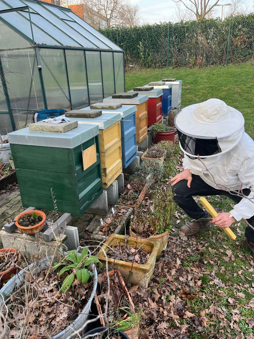Es ist für November viel zu warm, und die Bienen fliegen schon, als wäre es Frühling. Ein Bienenvolk flog allerdings nicht, was uns etwas beunruhigt hat. Daher haben wir am Wochenende die Mäusegitter entfernt und den Totenfall beseitigt. Im Winter fallen tote Bienen einfach aus der Traube und können das Flugloch verstopfen. Dieses Volk hatte besonders viele tote Bienen auf dem Boden, und nachdem wir diese ausgefegt hatten, konnten die Bienen auch wieder ungehindert fliegen. Etwa die Hälfte der Völker hatte ähnliche Probleme, die anderen haben ihre Beuten selbst aufgeräumt.