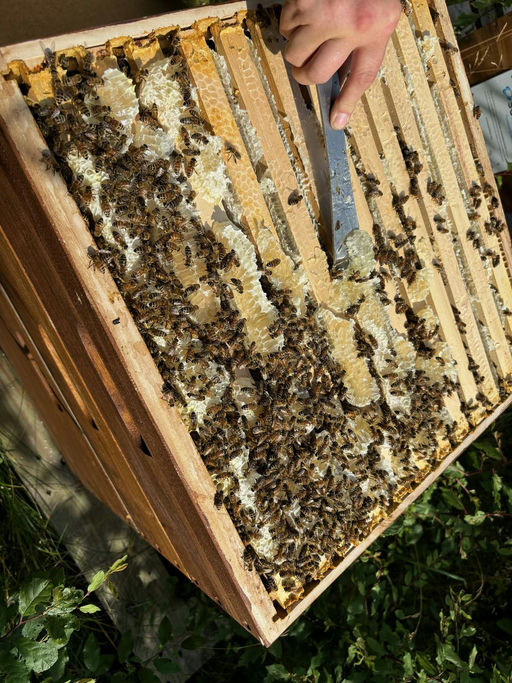 Unsere Bienen haben in diesem Jahr ein wahres Bienen-Restaurant in der Natur vorgefunden. Es gab so viel Nahrung, dass unsere Bienen zusätzlich zur „normalen“ Honig-Sommerernte eifrig Nektar einsammelten. So viel, dass mir der Honig schon förmlich entgegenfloss. Ein Geschenk? Nicht wirklich. Die Honigernte wird erschwert: Der eingetragene Honig ist schlichtweg zu flüssig, die Waben können nicht abgefegt werden und die Bienen tragen den Nektar in jede freie Zelle im Brutraum ein. Mit dem Ergebnis, dass die Königin keine leeren Zellen mehr findet, um ihre Eier abzulegen. Der Nachteil ist offensichtlich: Es schlüpfen zukünftig zu wenig Bienen, das Volk wird schwächer und kann nicht genügend Winterbienen aufziehen.