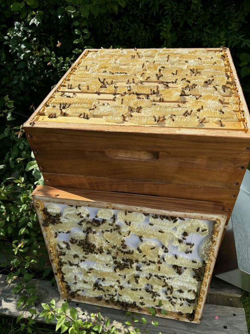 Um unsere Bienen vom Flying-Buffet wegzubekommen oder eben vom Betreten des Honigraums zu hindern, nachdem sie ihn freiwillig verlassen haben, habe ich Bienenfluchten eingesetzt. Und wir werden die Anzahl der Honigräume aufstocken, so dass unsere Bienen ausreichend Platz haben, um den frischen Nektar einzutragen.