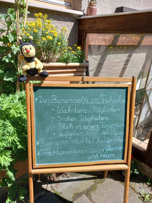 Wir haben uns bereits an den ersten Frühjahrsblumen gestärkt und uns über die Apfelblüten im Bienengarten gefreut. Unsere neue Königin ist wirklich eine gute Mama, die fleißig neue Eier legt, damit unser Bienenvolk wachsen kann. Unsere Imker Nicole und Karl haben uns auch schon zwei Honigräume aufgesetzt. Wir legen kräftig los, und im Garten herrscht manchmal richtig viel Flugbetrieb.