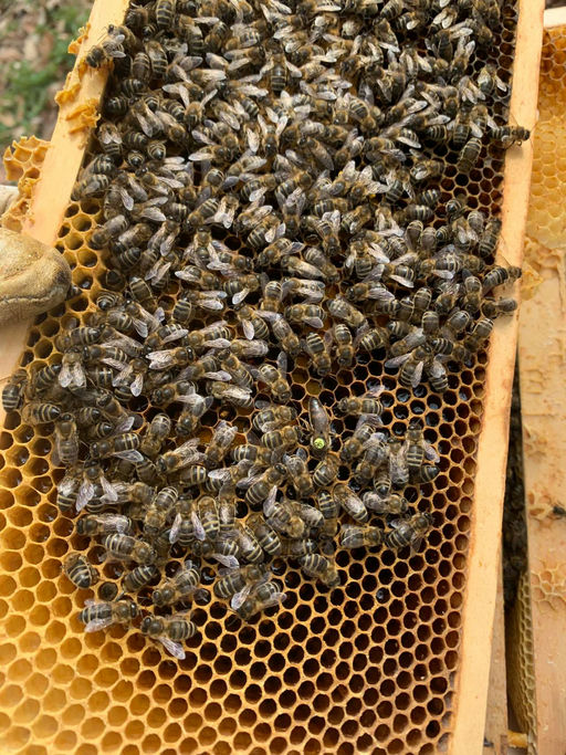 Das warme Frühlingswetter beschert den Bienenvölkern bereits eine Vielzahl an Pollen. Bei der Kontrolle zeigte sich teilweise auch die Königin (auf dem ersten Bild mit grünem Punkt zu sehen) – in den restlichen Völkern haben wir Brut entdeckt, was ebenfalls ein intaktes Volk auszeichnet. Wir freuen uns auf ein ertragreiches und gesundes Bienenjahr.