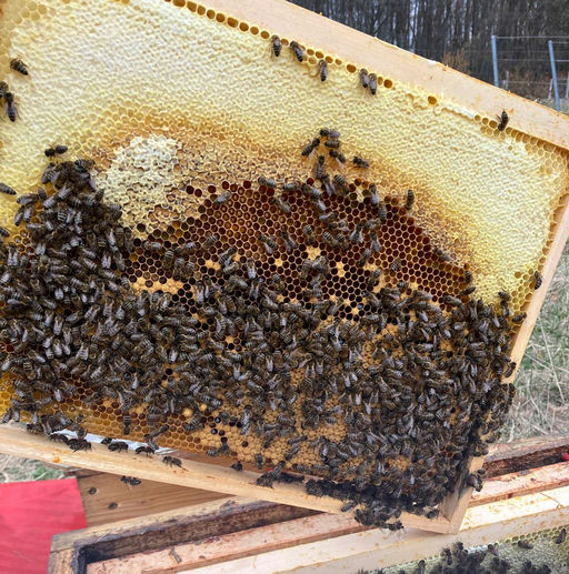 Jetzt ist es besonders wichtig, nach den Futterreserven in den Völkern zu schauen. Ein starkes Bienenvolk kann um diese Zeit etwa 1 kg Zucker pro Woche verbrauchen. Auf dem Bild sieht man eine Wabe aus dem Brutnest eines Bienenvolkes im März. Die Bienen haben einen Pollenkranz um die Brutzellen eingelagert, und direkt darüber sieht man das Futter, das mit Wachsdeckeln verschlossen ist. Beste Voraussetzungen für eine gute Entwicklung im Frühjahr.