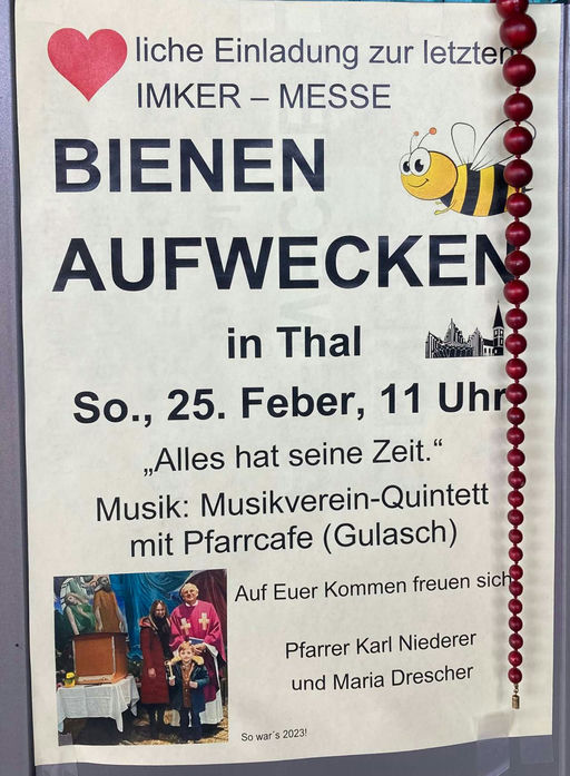 Letzte Woche gab es im Salzburger Land noch einen Wintereinbruch, während im Süden der Steiermark, im Raum Graz, bereits das Frühlingserwachen stattfand. Am Sonntag feierten wir in der Thaler Kirche das Bienenaufwecken mit dem Bienenverein Graz-Stadt und Pfarrer Niederer. Danach, da das Wetter so schön war, ging es direkt zum Bienenstand. Dort wurde den Bienen zur Sicherheit, falls noch ein Wintereinbruch kommt, köstliches Zuckerwasser in die Futterschale eingefüllt.