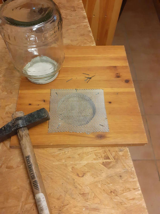 Da es in der Natur nur noch minimal bis keinen Nektar zu finden gibt, ist es Zeit geworden, zuzufüttern. Das mache ich mit Haushaltszucker, aufgelöst in Wasser. Um das Volk möglichst wenig zu stören, habe ich ein Deckelbrett angefertigt, in dem ein Loch ist, in welches das umgedrehte Glas mit dem Futter hineinpasst. In den Glasdeckel habe ich mit einem Nagel Löcher eingeschlagen, und durch diese kleinen Löcher können die Bienen ihre Zungen hineinstecken und das Zuckerwasser heraustrinken. Die Öffnung ist mit einem Gitter bedeckt, sodass keine Bienen nach oben herauslaufen können. Weil im Glas ein Unterdruck herrscht, läuft auch kein Futter aus. Täte es das, wäre die Katastrophe perfekt. Es darf um diese Zeit niemals Zuckerwasser gekleckert werden oder etwas auslaufen. Sonst fängt eine große Räuberei an. Das kann schon auch mal ein ganzes Volk kosten! Auswärtige Bienen bekommen das mit und kommen in großer Zahl kampfbereit angeflogen, um ihre eigenen Vorräte aufzustocken.