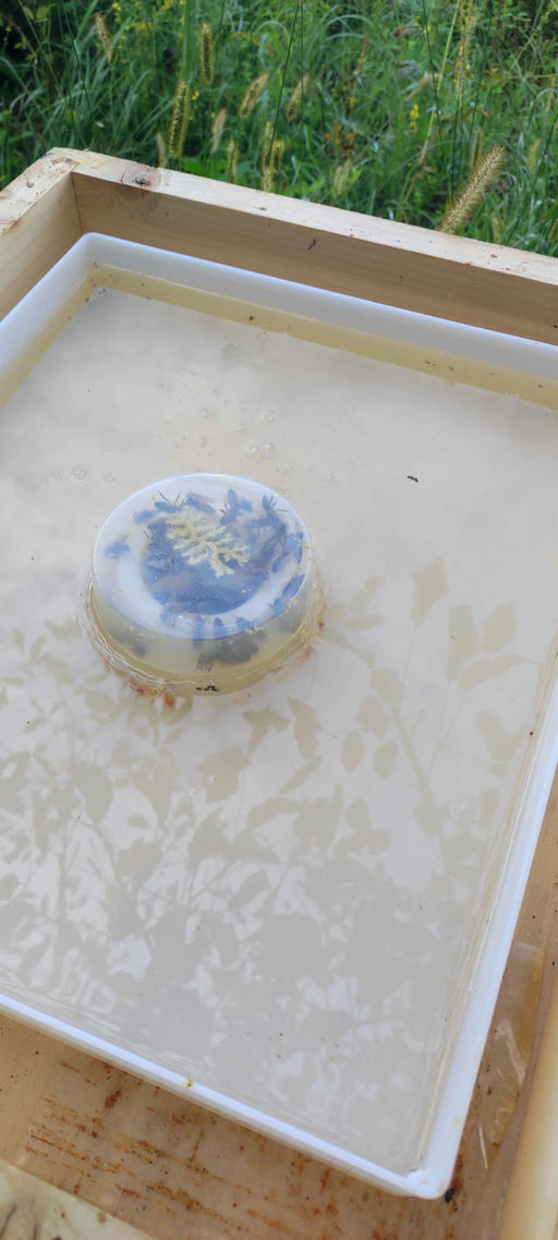 Nach der Honigernte ist Füttern angesagt. Die Bienen brauchen einen Wintervorrat, den wir ihnen weggenommen haben. Zuerst wird eine Biozuckerlösung im Verhältnis 1:1 (Zucker: Wasser) gefüttert, damit die Mittelwände ausgebaut werden, was um diese Jahreszeit recht schnell geht. Danach wird mit einem 3:2 Sirup das eigentliche Winterfutter verabreicht. Im September steht dann die letzte Varroabehandlung an.
