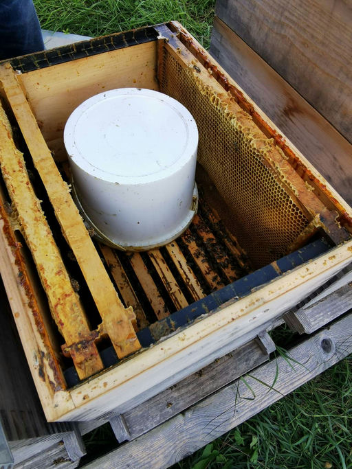 Damit die Bienen nun mit ausreichend Vorräten Richtung Winter gehen, geben wir die erste Ration Futter in Form von Zuckersirup. Dieser wird in einem lebensmittelechten Eimer gefüttert. Der Deckel des Eimers hat ein Loch, das mit einem feinen Gewebe verschlossen ist. Die kleinen Sirup-Tröpfchen, die daran entstehen, werden dann von den Bienen aufgenommen und in den Waben gelagert.