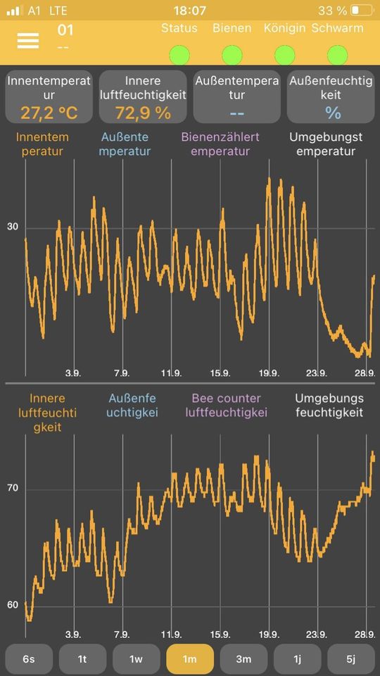 Im September wurde nochmals gründlich mit Zuckerwasser eingefüttert und überprüft, wie es den Bienen geht. In einem Bienenstock wurden die Daten von unserem Stockherz ausgelesen, das im Inneren des Stocks eingesetzt wurde, um Temperatur, Feuchtigkeit, Frequenz etc. zu messen, ohne den Wärmehaushalt der Bienen zu stören.