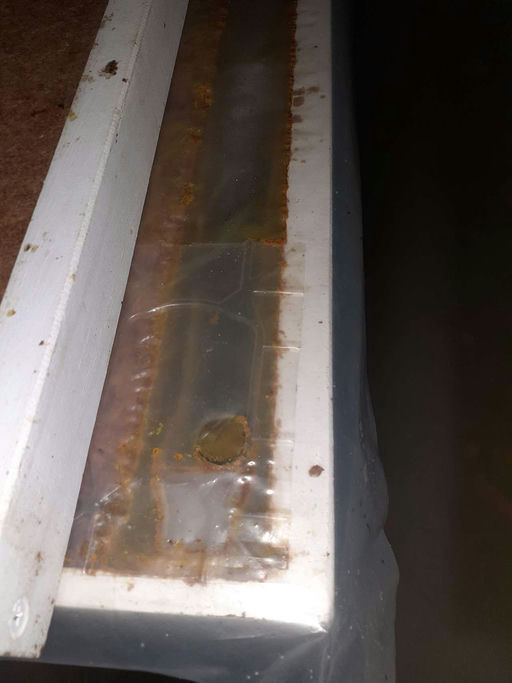 Ich habe mir etwas dazu einfallen lassen: Es liegt nun eine feste Abdeckung auf den Rähmchen und es gibt ein kleines (ebenfalls abgedecktes!) Loch – gerade nur so groß wie ein kleiner Finger, direkt über der Futtertasche. Ich öffne also den Deckel und habe dabei alles schon griffbereit. Schnell stopfe ich den Trichter in das Loch. Bereits jetzt schon strömen die Bienen in falscher Fahrtrichtung aus dem Trichter heraus! Es ist mir unerklärlich, wie sie so schnell wissen, dass der Bär durch diese Röhre erreichbar ist! Deswegen kippe ich in Windeseile den Sirup in den Trichter. Wenn ich schnell genug bin, schafft es keine bis zu mir, sondern dümpelt nun leider süßgetränkt in der Futtertasche. Das tut mir natürlich schrecklich leid, aber was soll ich sonst tun? 🤷♀️