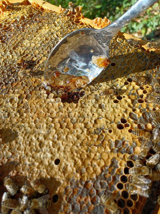 Die Bienen werden auf den Winter vorbereitet. Hierzu bekommt der Ableger Mittelwände zum Ausbauen, das Volk wird einer Varroa-Behandlung unterzogen und es wird eingefüttert.